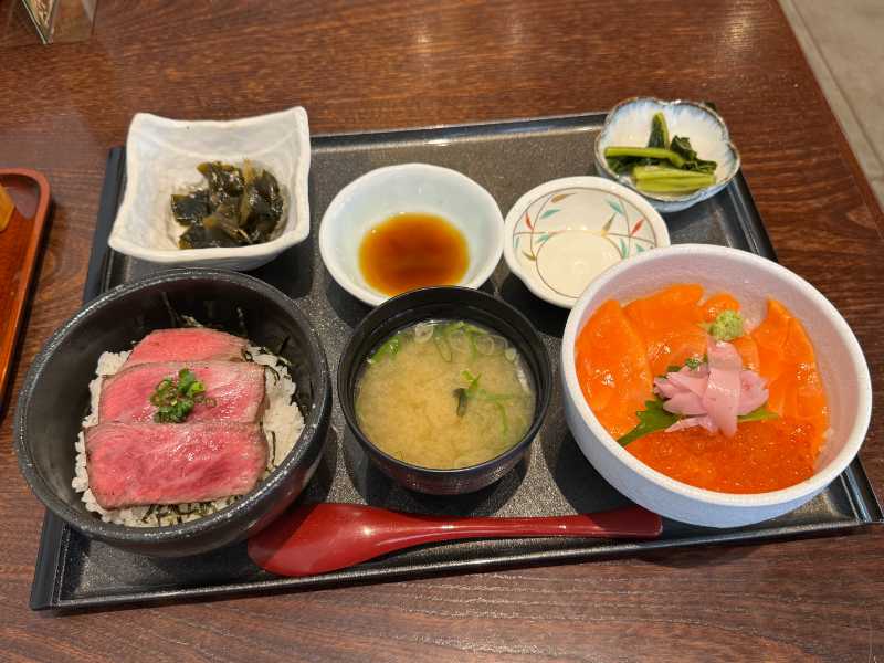 村上名物の鮭料理と村上牛を同時に楽しめる特選丼セット!【石挽き蕎麦と和食処 悠流里】(新潟県村上市)