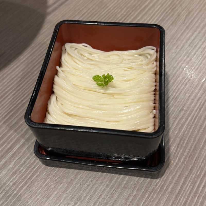 うどんは少し冷や麦のような印象を受ける細めのタイプで、プリプリと歯切れの良い柔らかめの食感。