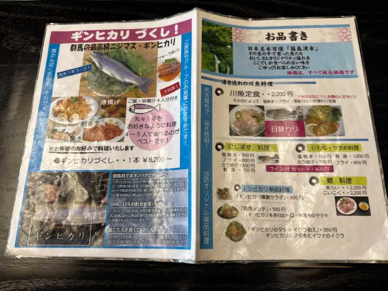日本名水百選「箱島湧水」のすぐそばにあり、採卵用の親魚や群馬ブランド魚「ギンヒカリ」、あづま養魚場オリジナル高級魚「シルクサーモン」、ヤマメ、イワナ、アユなどを育てているとのこと。