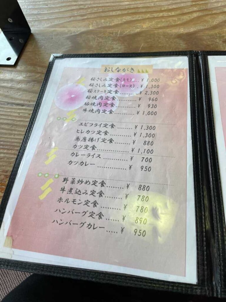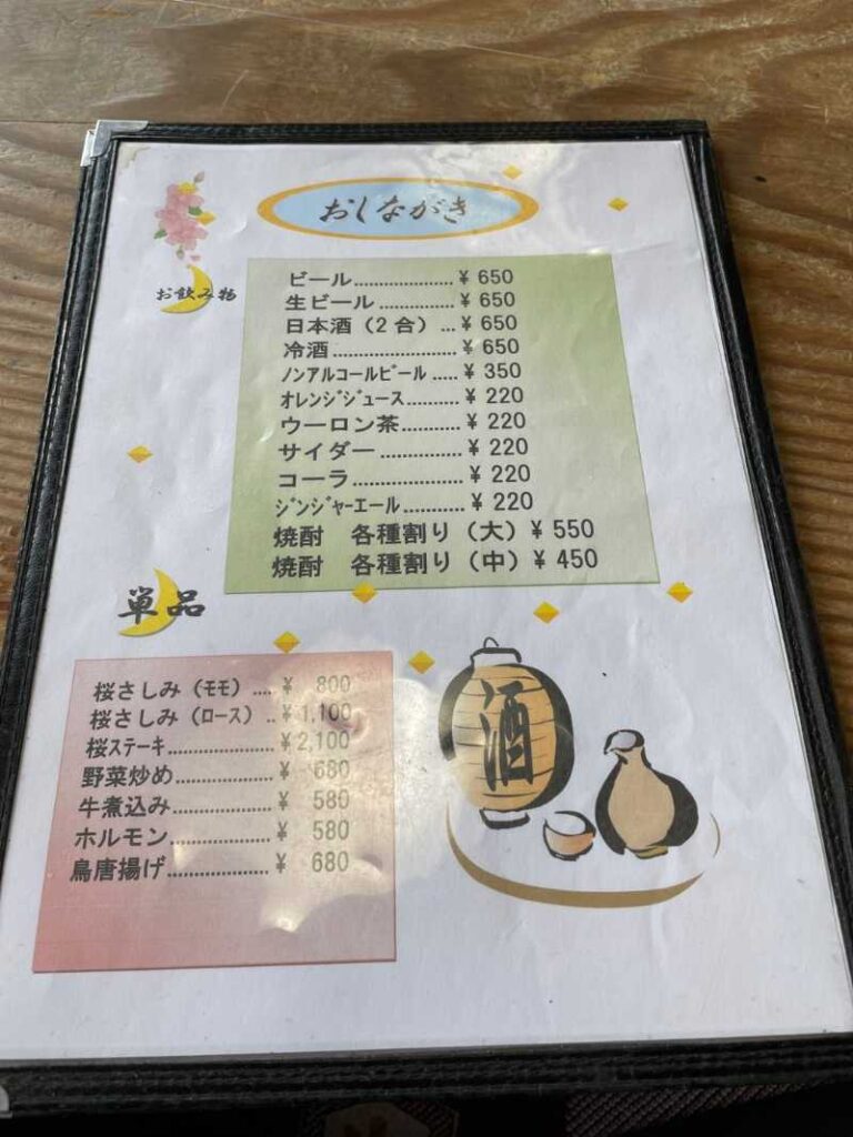 馬肉は刺身はもちろんのこと、焼肉、ステーキ、桜鍋(期間限定)などもありました。