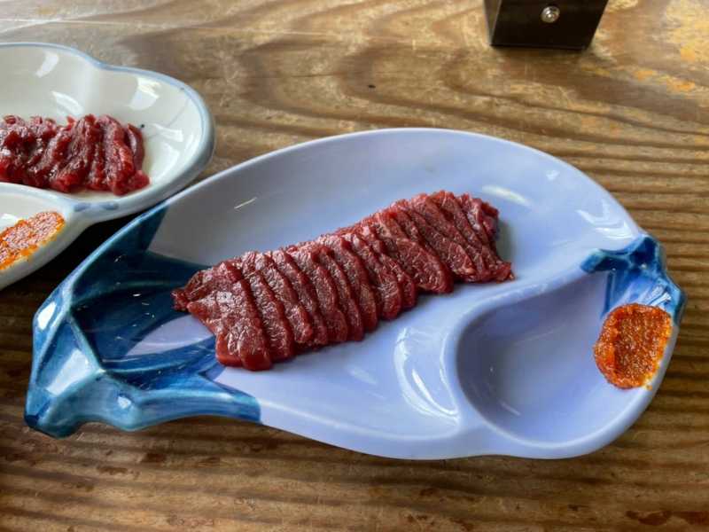 醤油のみと、醤油+辛子味噌とで両方食べ比べてみたのですが、馬刺し単体なら肉の味わいをより感じられる醤油のみ、ご飯と食べるなら辛味が強くてコクと旨みが増す辛子味噌入りの方が好みという結果でした。