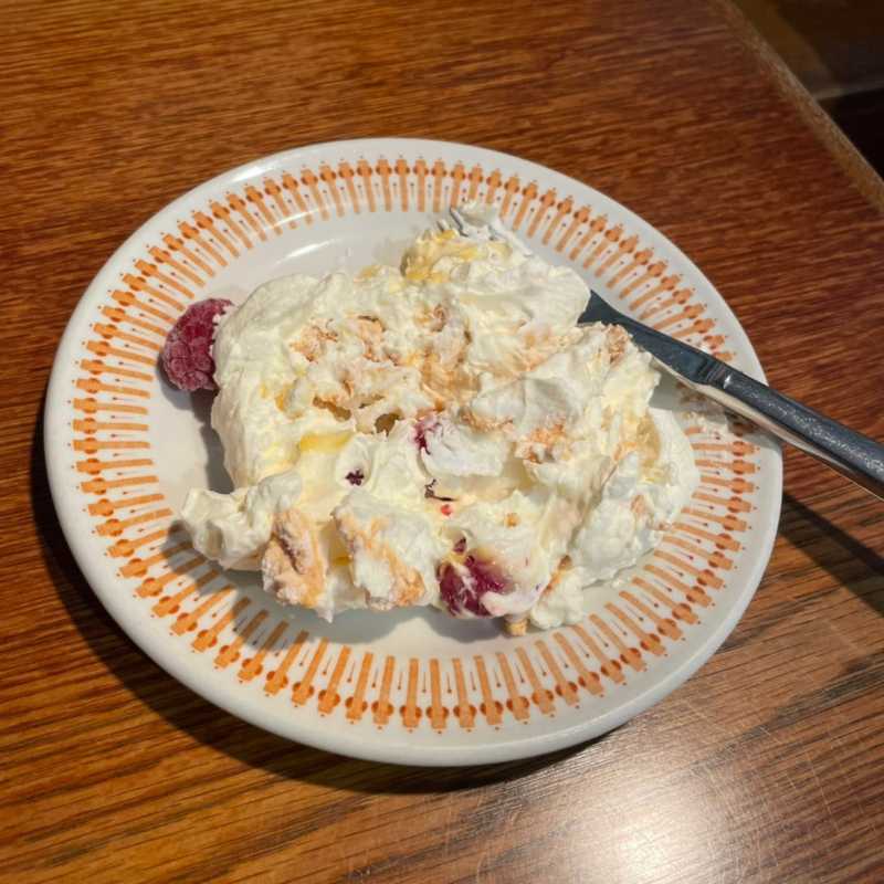 下には凍ったラズベリーに、ドロッと粘度高めのカスタード、こんもり乗った生クリーム、そして3時間かけて焼き上げたメレンゲをトッピング。