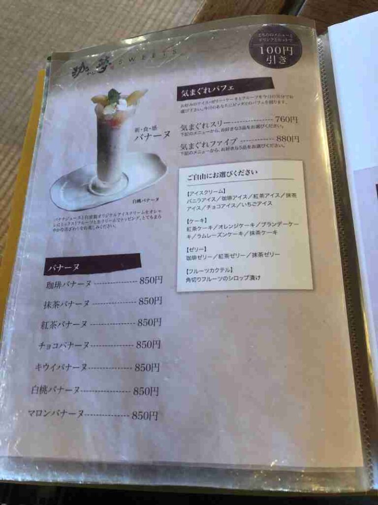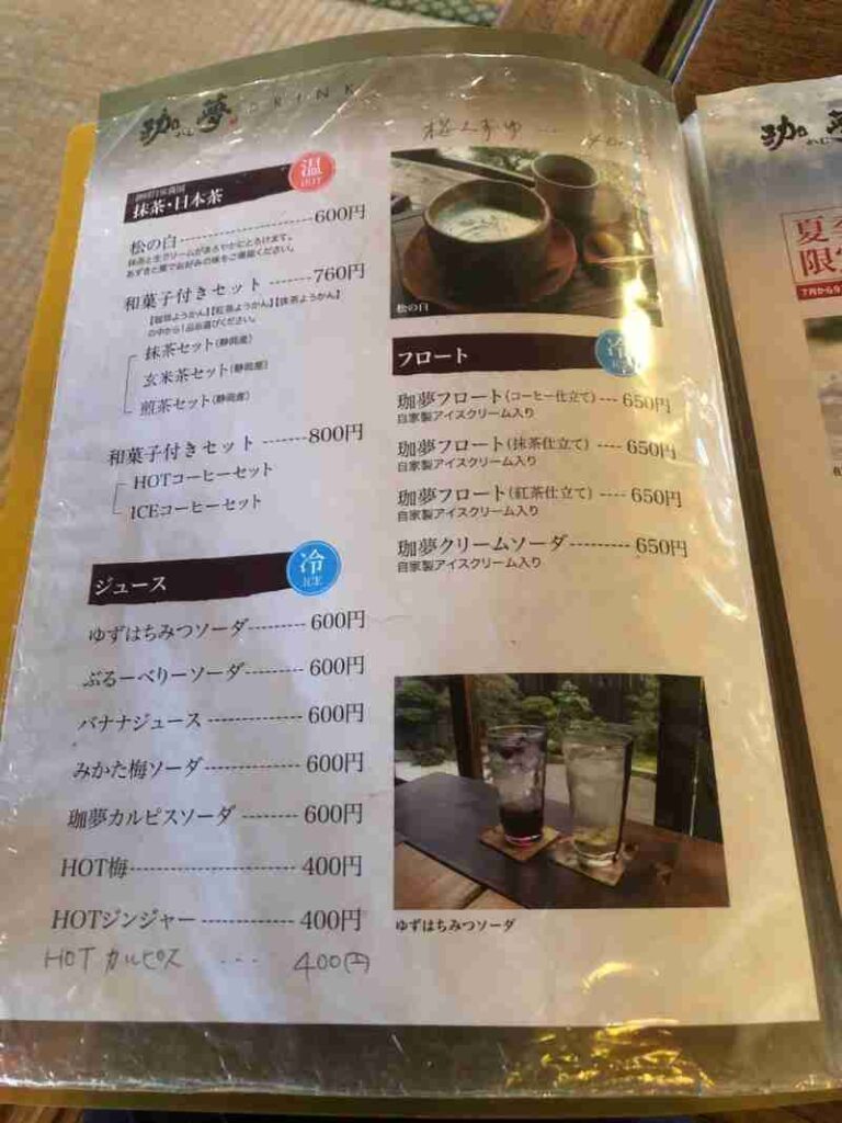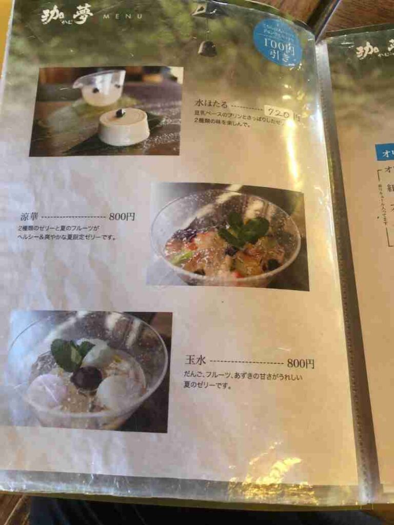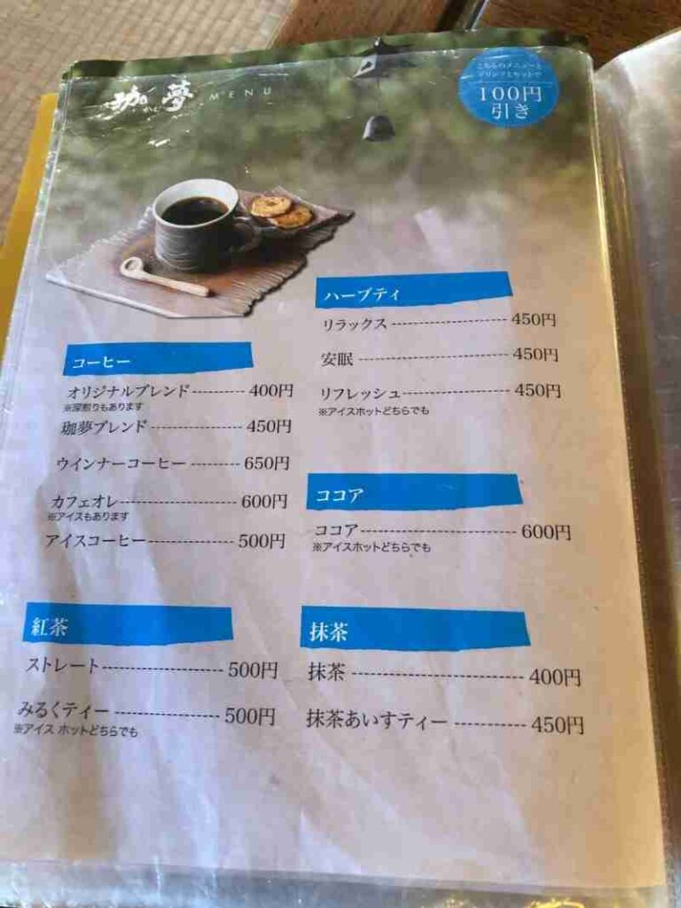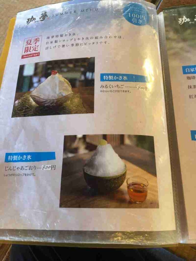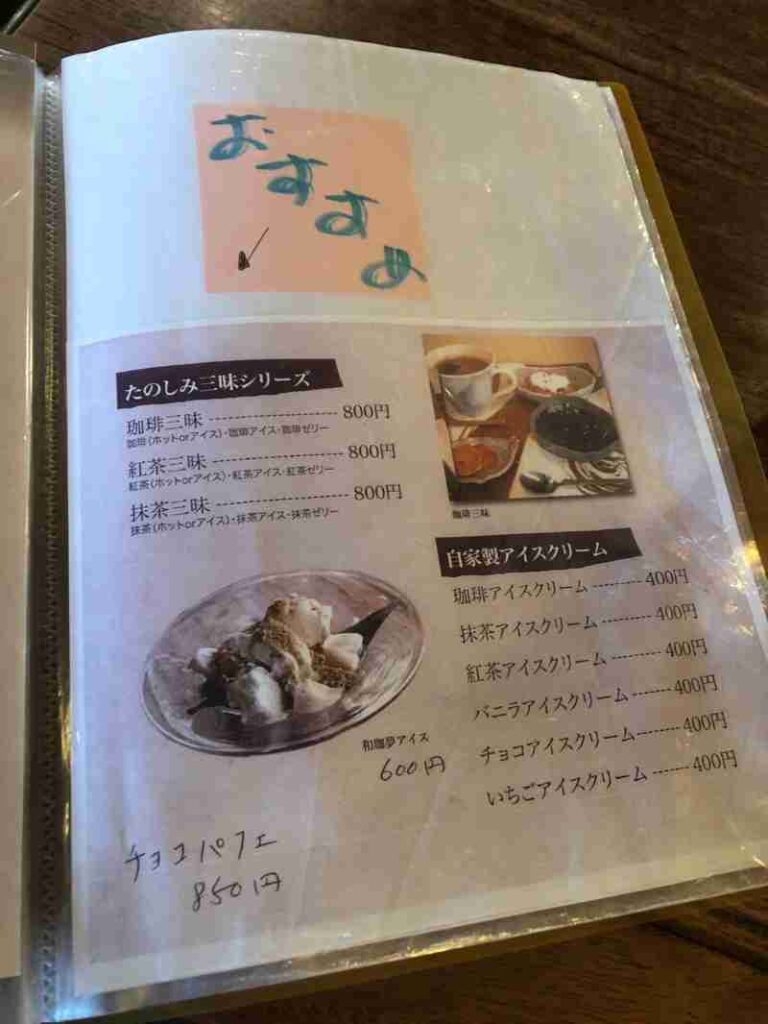 メニューを見るとコーヒー、お茶類、ジュースなど豊富な種類のドリンクに、ケーキ、かき氷(7~9月下旬限定)、パフェ、アイスなど様々なスイーツ類が並びます。