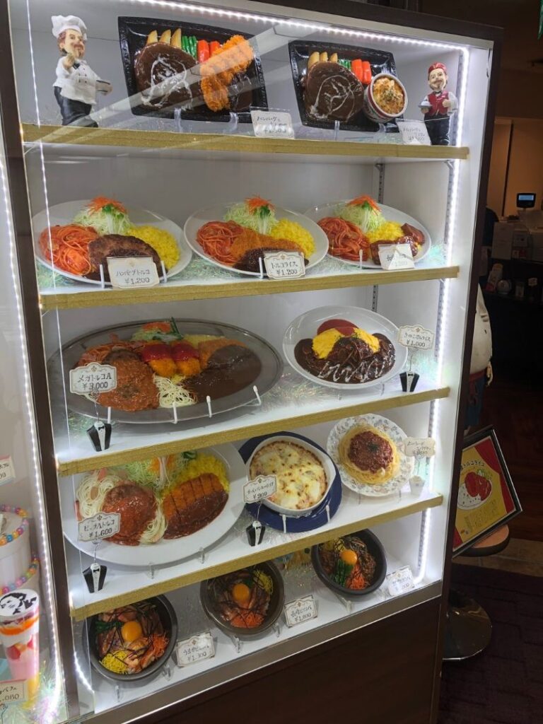入口の横には目を引く食品サンプルがズラッと並んでいて、ドカ盛りグルメのボリュームの凄さがよくわかります。