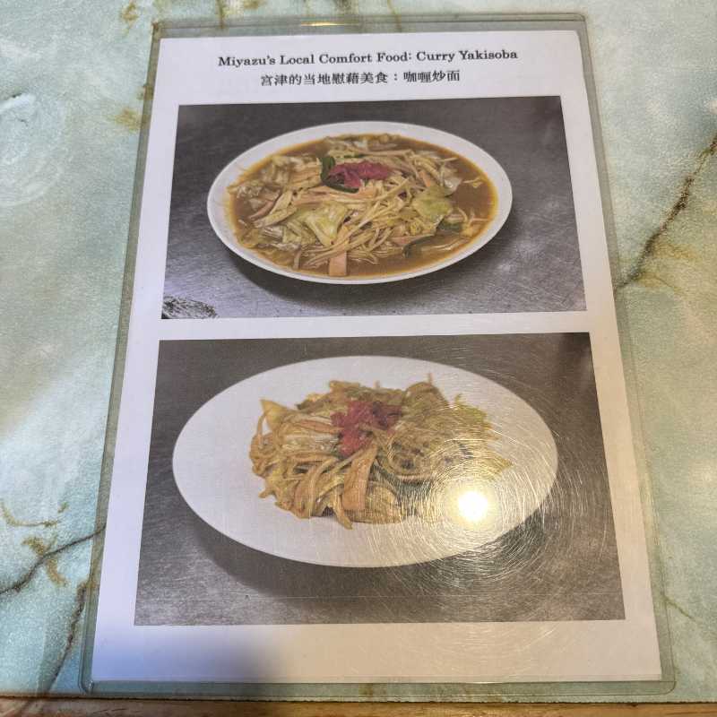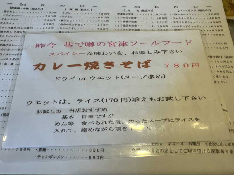 こちらのお店のカレー焼きそばは、豚で取ったスープに数種類のスパイスを利かせて仕上げているそうで、宮津で一番スパイシーといわれているという情報が出てきました。