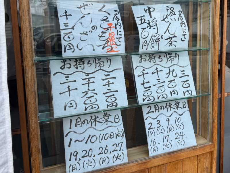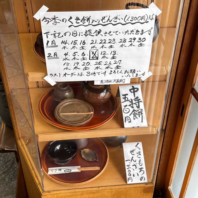 公式サイトによると、他にも冬季限定メニューとして「きなこがけ草餅と煎茶のセット」と「冷たいぜんざいと煎茶のセット」があるそうですが、今冬は休止中とのこと。