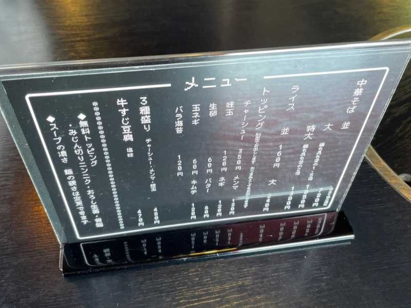 看板メニューの中華そばは、富山県のご当地ラーメンとして知られる「富山ブラック」タイプの濃口醤油ラーメン。