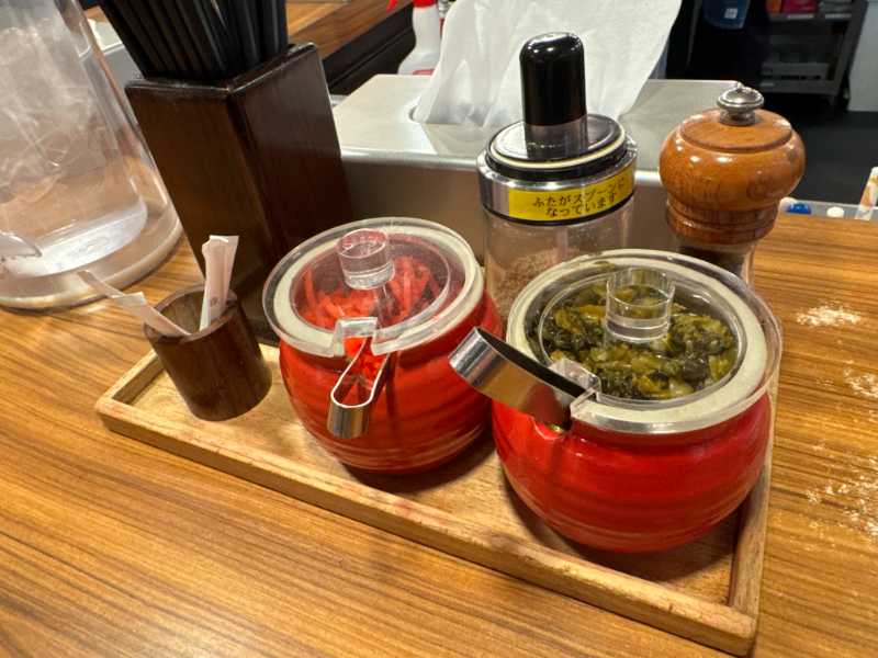 卓上には高菜や紅生姜、胡麻などのアイテムも充実しています。