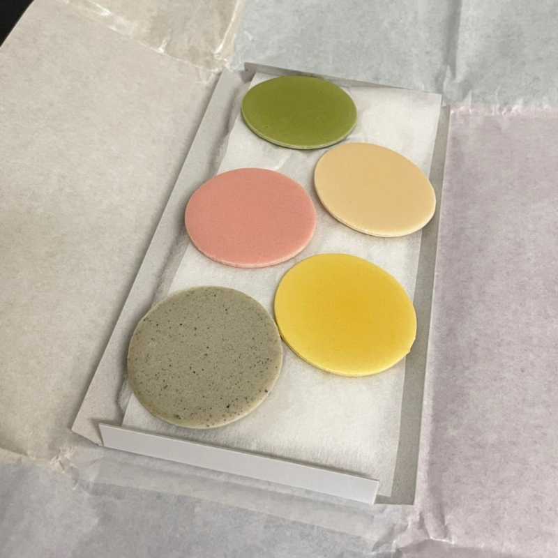 薄氷をベースに、「現代に愛される一品を」と生み出した商品で、5つのTONE(色合い)とTASTE(味わい)を桜(塩味)・抹茶(苦味)・ゆず(酸味)・和三盆(甘味)・胡麻(滋味)の5つの味で表現しているそうです。