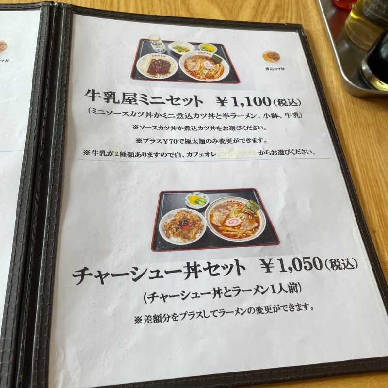 今回は人気NO.1という、半ラーメン、ミニカツ丼(ソースor煮込)、そして牛乳(白orカフェオレ)も付いた『牛乳屋ミニセット』を注文!