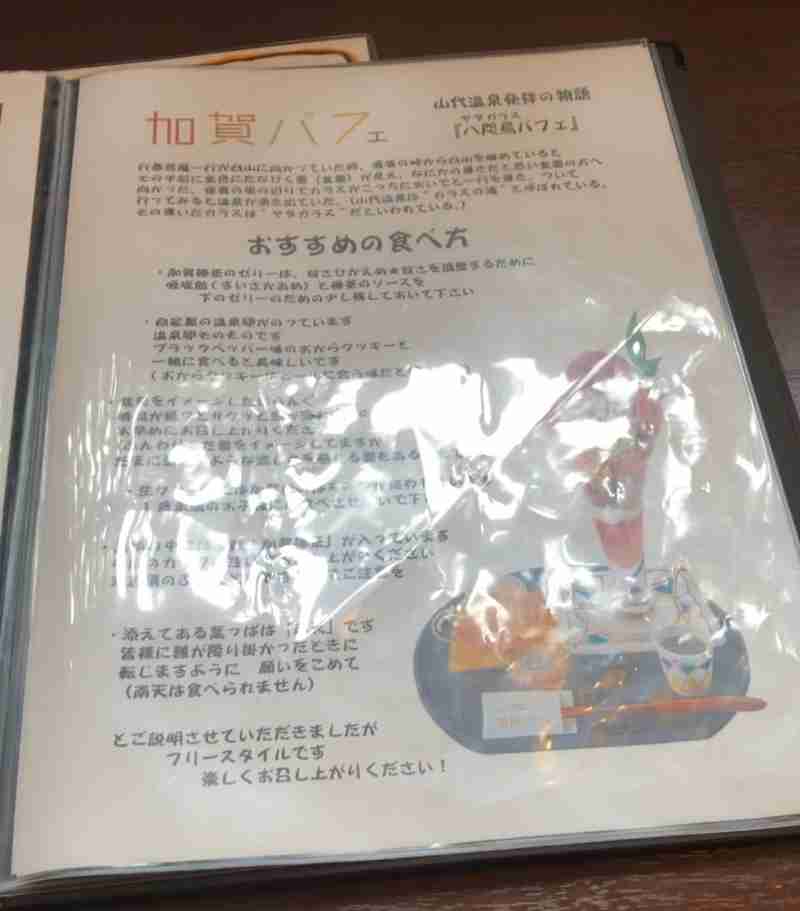 メニュー名は「加賀パフェ」ですが、テーマは725年に行基によって発見された山代温泉の発祥物語にちなんだ「八咫烏(ヤタガラス)パフェ」だそうです。