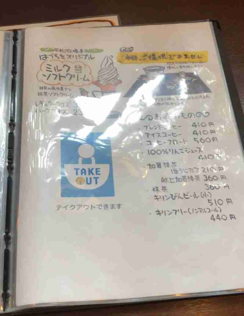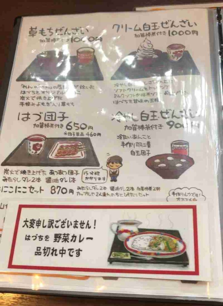 メニューを見るとぜんざいやかき氷、ソフトクリームなどのスイーツ、そしてオススメという野菜カレーなどご飯ものもあります。