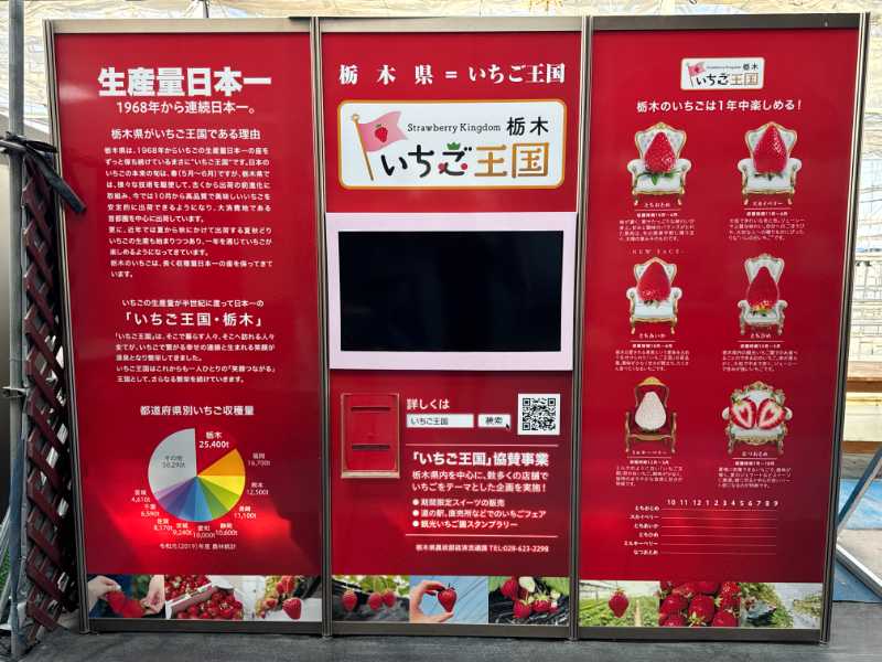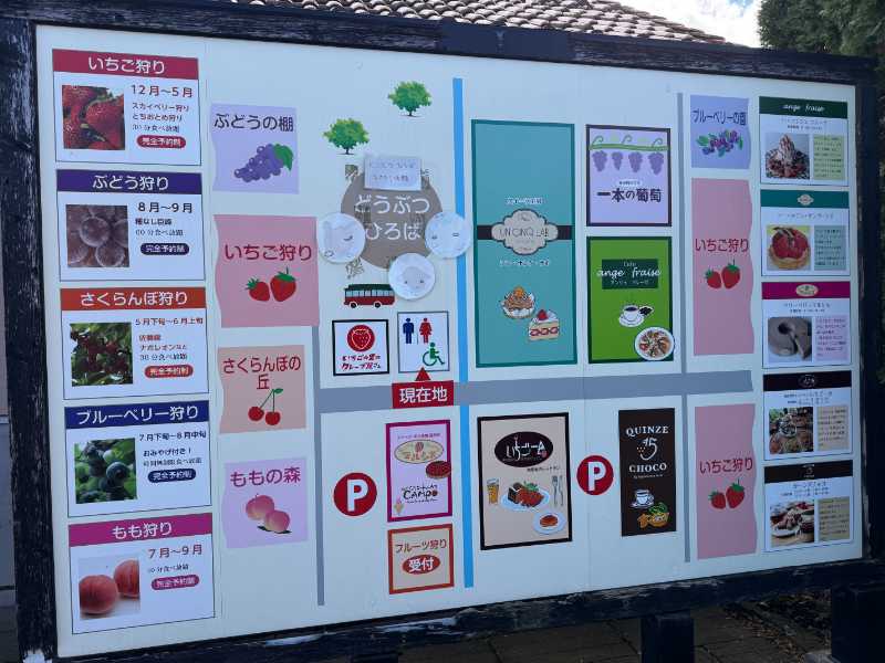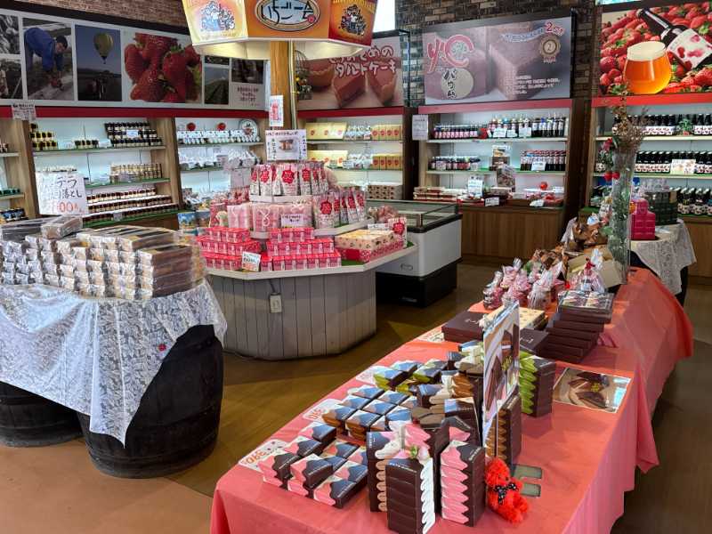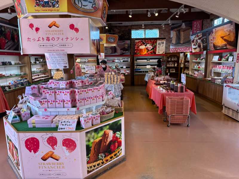 いちごをはじめ、さくらんぼ、桃、ぶどう、ブルーベリーなど様々なフルーツ狩りを楽しむことができ、広大な敷地内には以下のようにいちごを堪能できる様々なお店が立ち並ぶ、まさにいちごのテーマパーク。