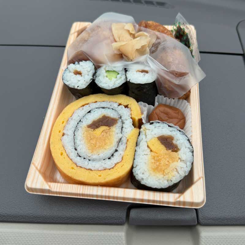 本来の内訳はいなり2、押しすし1、太巻き1、細巻き(かんぴょう)3、かっぱ巻2、玉子焼き1のようですが、この日は玉子焼きが伊達巻になるそうで、それに合わせて内訳が微妙に変わっていました。