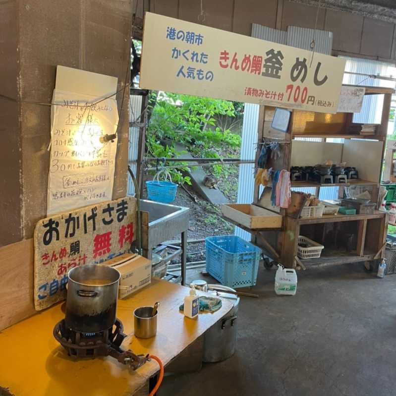 今回特に気になったのが、こちらの朝市名物という金目鯛の釜飯や、無料でいただけるという金目鯛のあら汁。