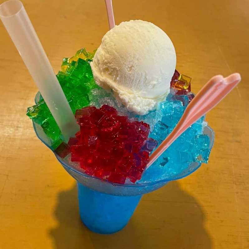 かき氷の上に、カラフルなシロップ漬け?のところてんの刻みとアイスクリームをトッピングした感じです。