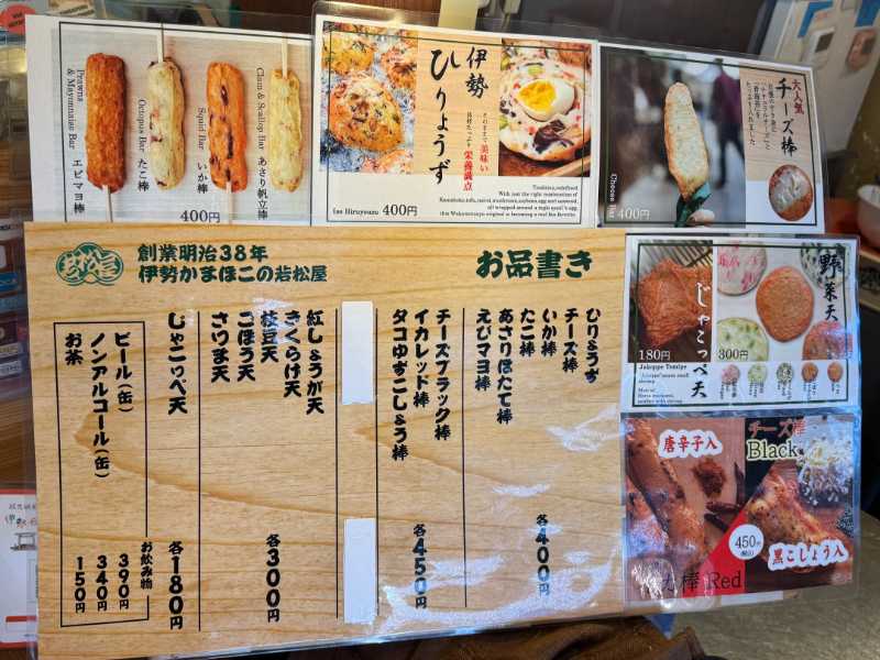 メニューは豊富なラインアップですが、今回は目当ての『伊勢ひりょうず』と、大人気と書いてあった『チーズ棒』を購入。