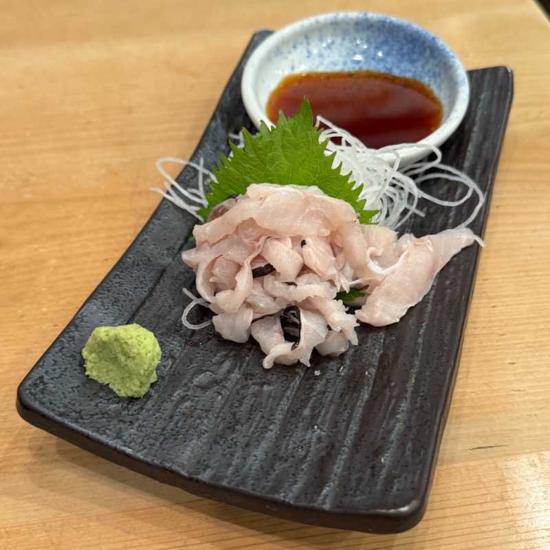 あっさりとした上品な旨みが広がる淡白な味わいで、わさび醤油とだいだい(橙)のポン酢が用意されていましたが、特にわさび醤油が相性抜群で美味しかったです。