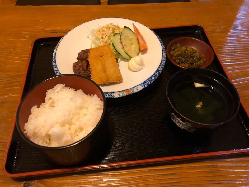 最後にすり身団子、フライ、お吸い物、漬物、ご飯がまとめて定食のように来ました。