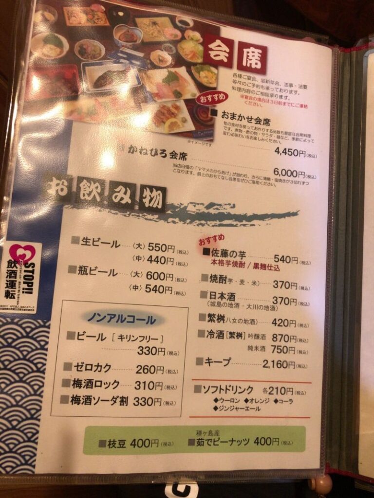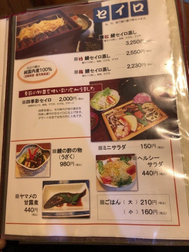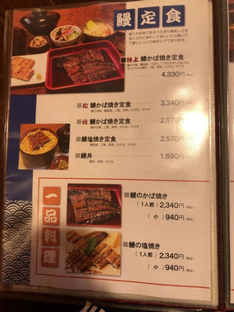 提供までにメニューを見ていると、エツ料理以外はうなぎや会席料理がメイン。