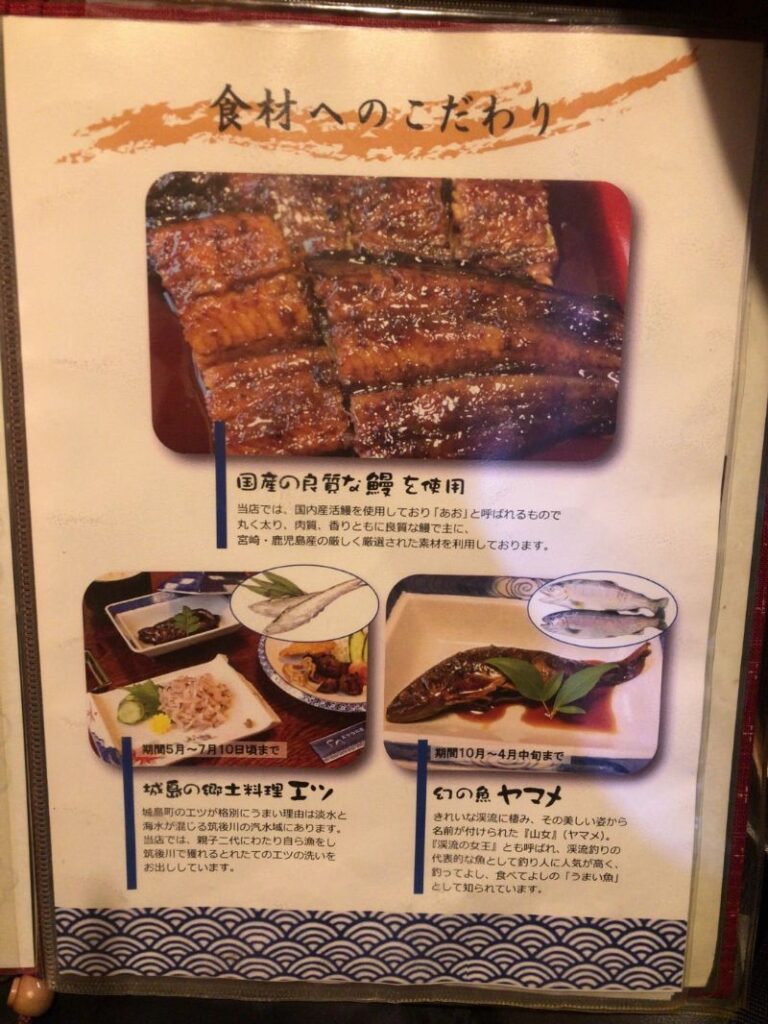 現在はエツ料理だけでなく、国内産活鰻「青」を使用したうなぎ料理や、10〜4月には「ヤマメ」の料理などを提供しています。