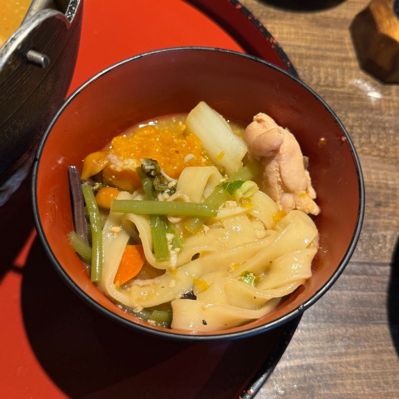 巨大なかぼちゃはとても甘さが強く、鶏肉は旨みの良いアクセントに、山菜はシャクシャクと食感が良く、具材によく味が染みていて美味しかったです。