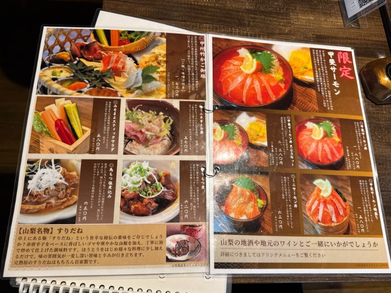本店は120年前の古民家を改装した店舗で、ほうとうをはじめ「とりもつ煮」、「馬刺し」、「甲斐サーモン」といった様々な山梨名物や、「甲州竹かご御膳」など本店限定の人気メニューなど豊富に取り揃えているとのこと。