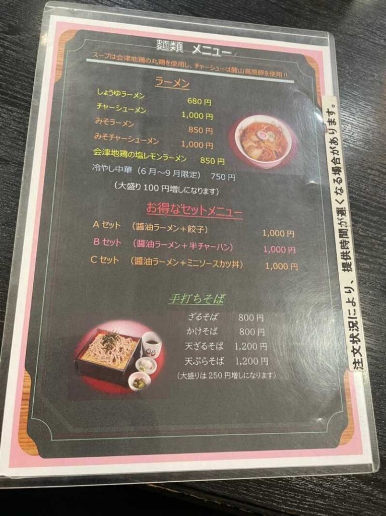 メニューを見ると創作グルメ以外にも普通の喜多方ラーメンや、ソースカツ丼、馬刺し、ニシン山椒漬けなどの会津名物もあります。