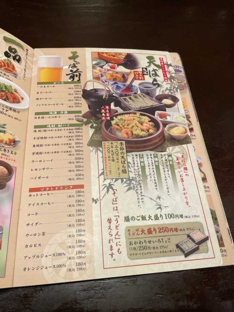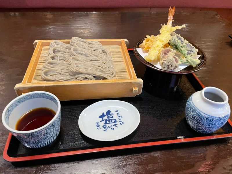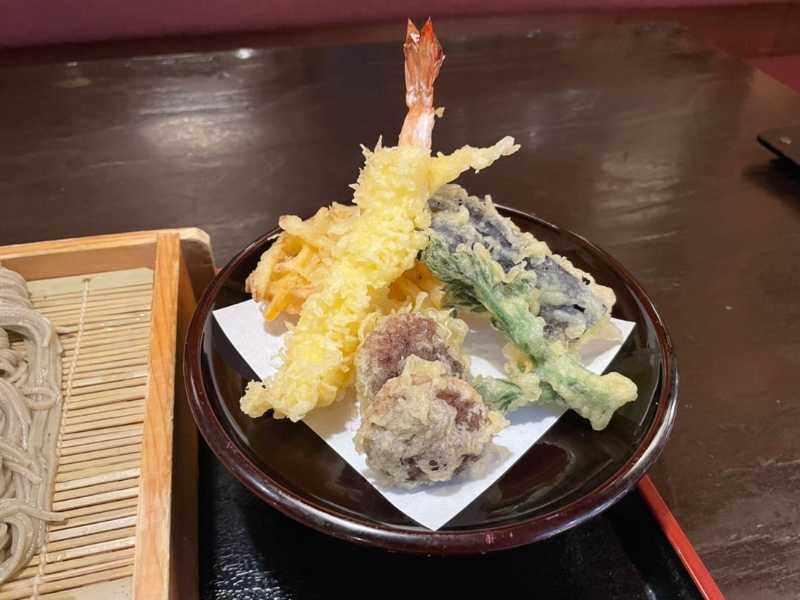 天ぷらの内訳はかき揚げ、海老、ナス、しいたけ×2、山菜×2だったと思います。