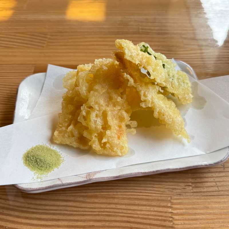 凍みこんにゃく自体には味はほとんどない印象ですが、油の香ばしい風味と衣の食感、抹茶塩の組み合わせがとても美味しかったです。