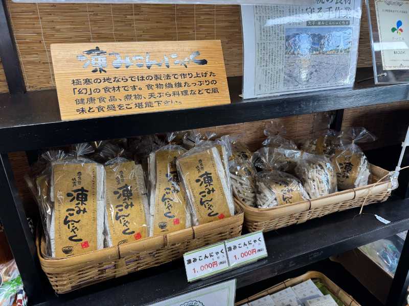 「凍みこんにゃく」は製造には手間がかかり、冬の厳しさ、農業従事者の高齢化などによって1960年頃から生産者が激減し、現在は全国でもこの地域の数軒のみで生産される希少な食材になっているとのこと。