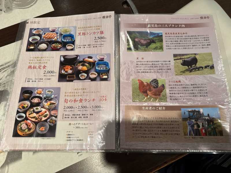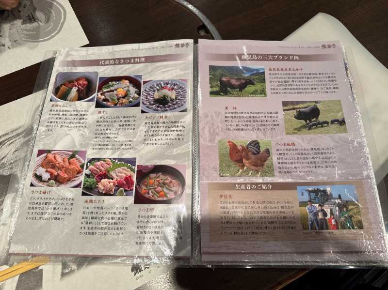 黒豚しゃぶしゃぶ、酒ずし、さつま揚げ、地鶏の刺身、キビナゴ刺身、とんこつ、さつま汁といった様々な薩摩郷土料理を、少しずつ楽しめる豊富なコースメニューを取り揃えていることが特徴。