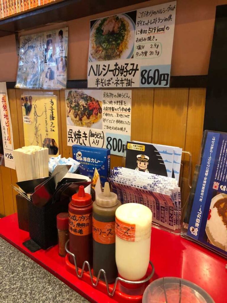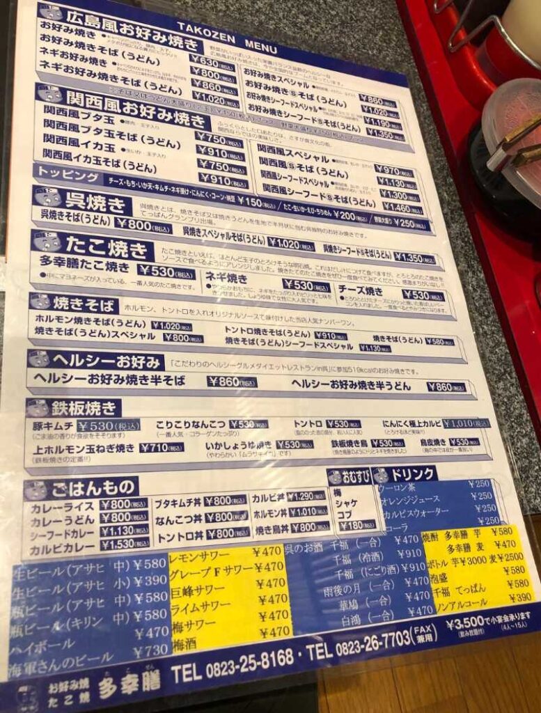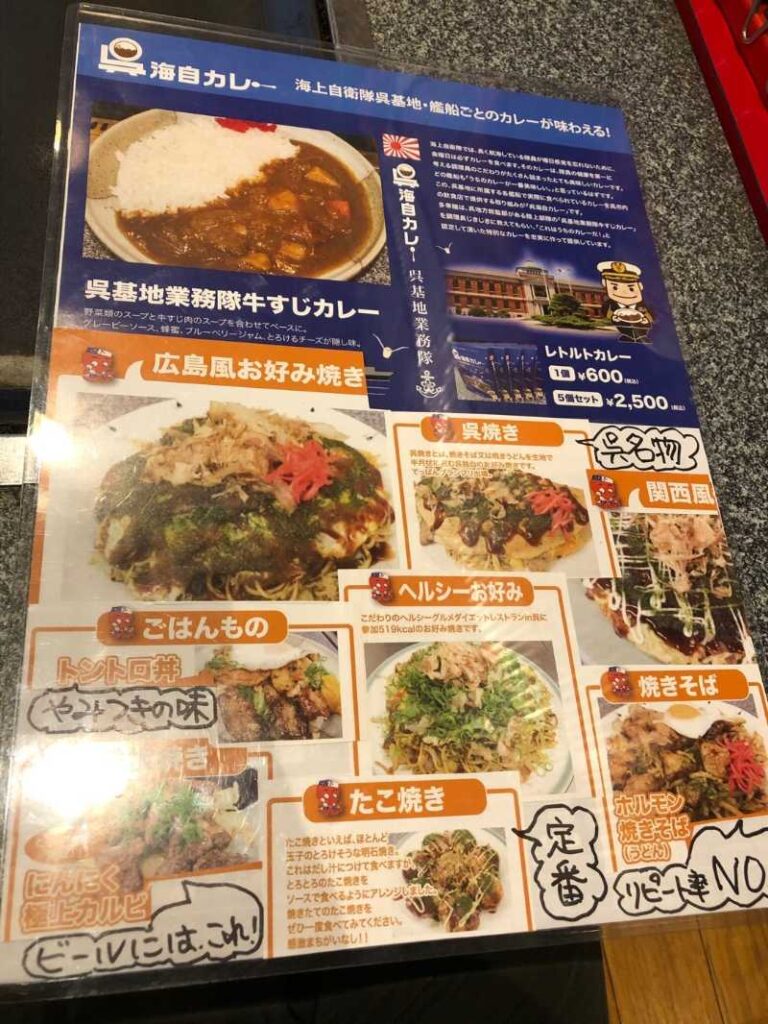 呉焼き以外にも、広島風・関西風それぞれのお好み焼きや、たこ焼き、おつまみの鉄板焼、丼物、海自カレー等、幅広いメニューを取り揃えた人気店です。