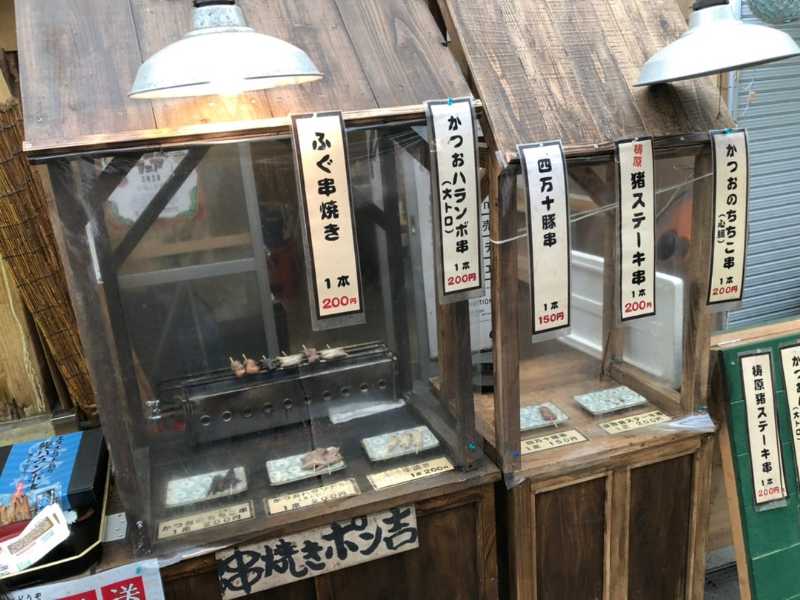 高知県高岡郡中土佐町の「久礼大正町市場(くれたいしょうまちいちば)」にある、露店型の串焼き専門店『串焼きポン吉』。