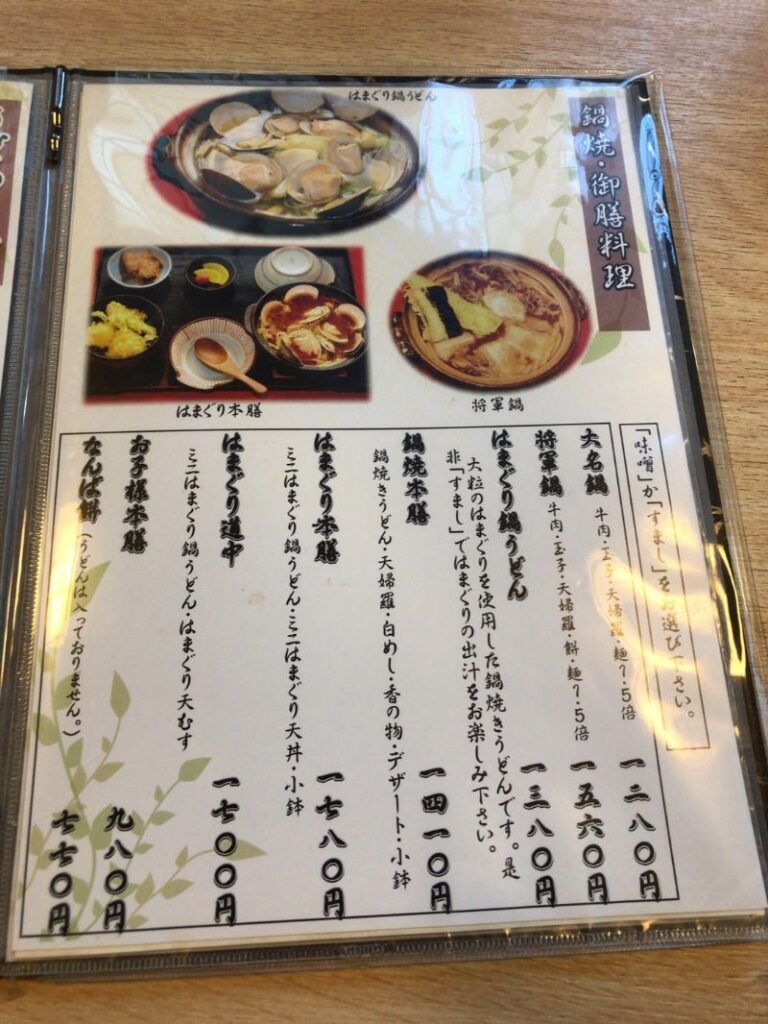 今回はうどんと餃子を食べましたが、まだお腹に余裕があったので、はまぐり天丼などもセットになった「はまぐり御膳」にしておけばよかったかもしれません。