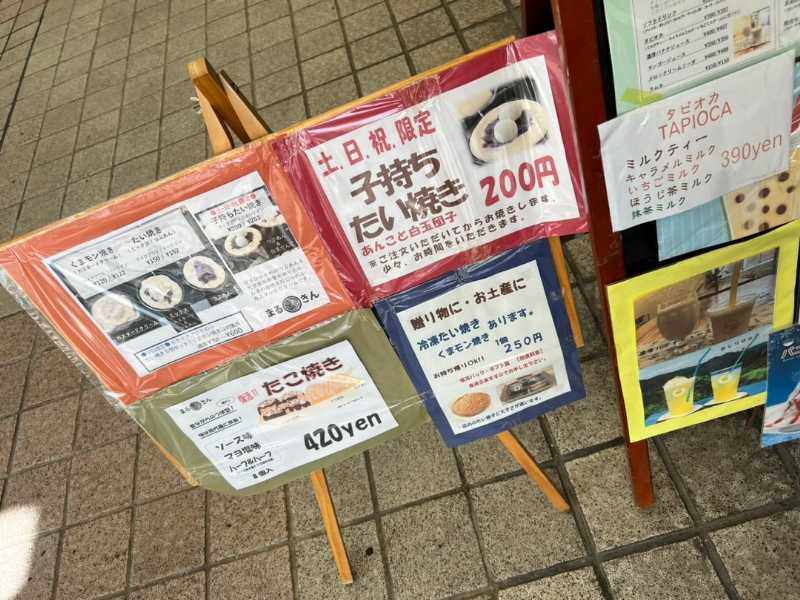 商品はカスタードクリーム入りの『くまモン焼き』、カスタードとつぶあんが両方入った「ミックス」と「つぶあんのみ」が入った2種類がある『たい焼き』、土日祝限定のつぶあんと白玉が入った『子持ちたい焼き』がありました。