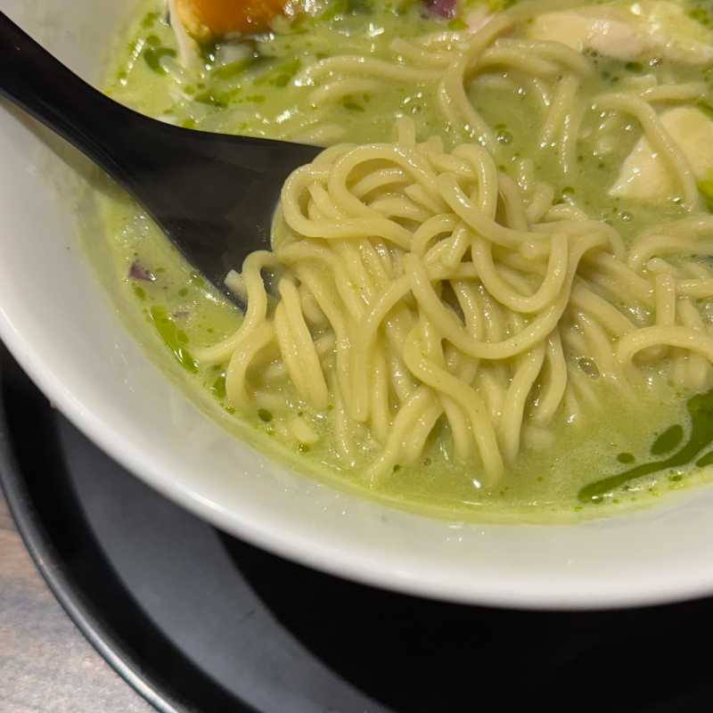 スープはしっかり緑色ですが、ほんのり甘みが利いた濃厚でクリーミーな鶏白湯の味わいがメイン。