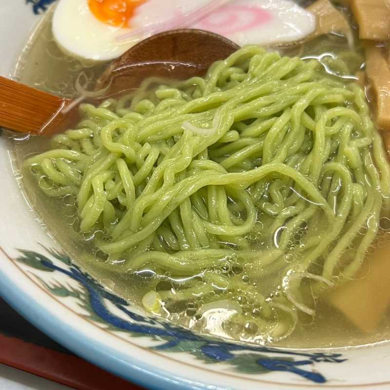 麺は確かにヒスイを彷彿させる綺麗な緑色で、少し柔らかな食感の中細縮れ麺。