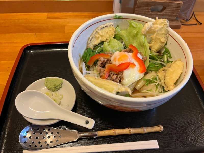 天ぷらはナス、玉子は黄身が結構固まったタイプ、ひき肉はあまり麺に絡まず下に沈んでいきますが、穴あきのレンゲで掬いやすいのが良いですね。