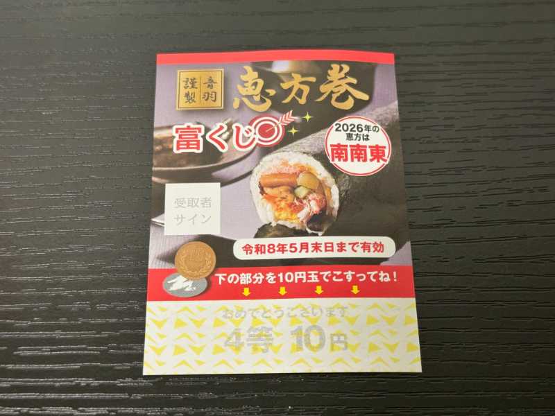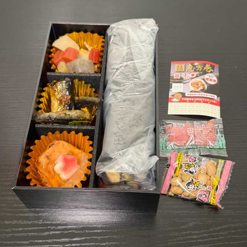巻き寿司だけでなく副菜も付いており、福豆やお店の金券くじが付いているのも嬉しいポイント。