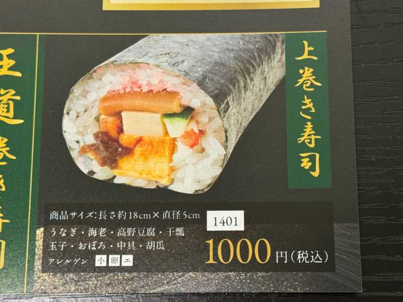 上巻き寿司は定番の具材を使用したオーソドックスタイプの恵方巻きで、ボリュームも標準くらいの印象。