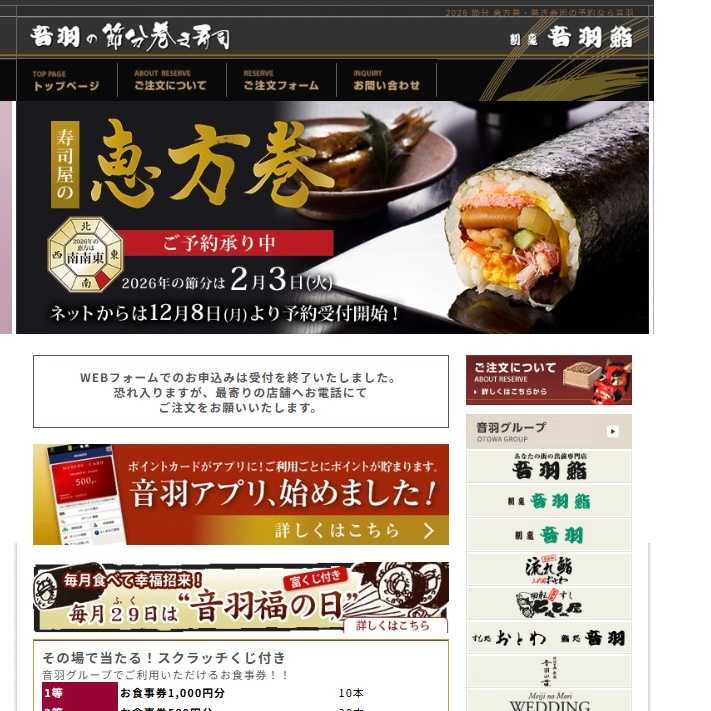 『流れ鮨三代目おとわ』に限らず、「音羽グループ」のお店では恵方巻きのネット予約や、宅配などを受け付けており、私も今回は1カ月くらい前にネットで注文。