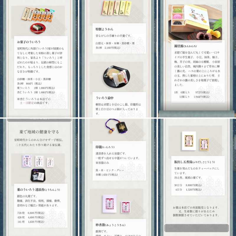 取扱商品については公式サイトにこんな感じで掲載されているので、写真は撮っていませんが、薬と和菓子が同じ店内に並んでいるのは不思議な光景。