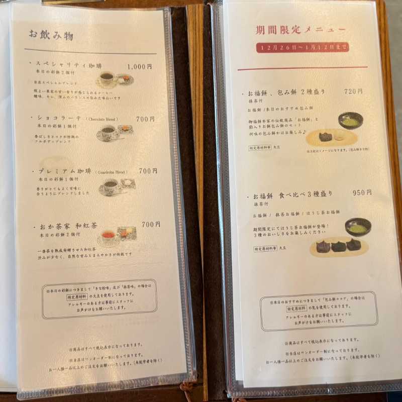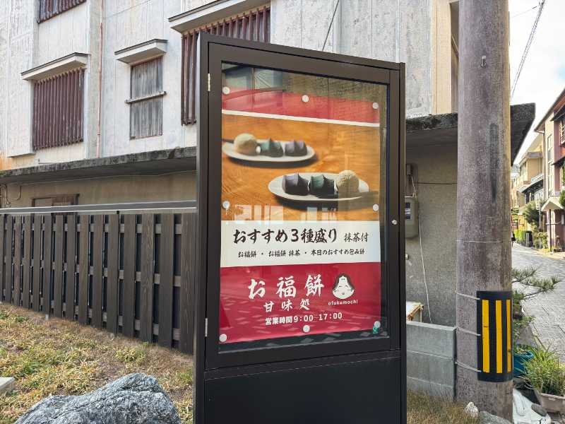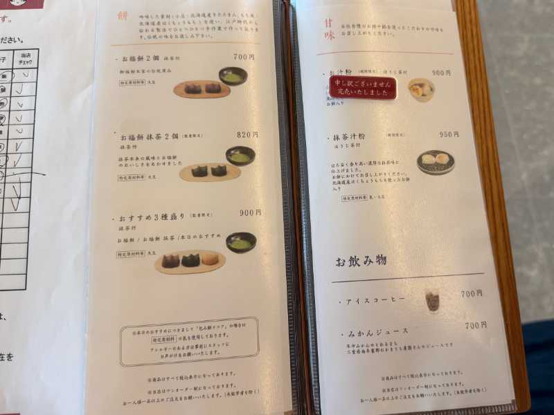 甘味処のメニューはこんな感じで、お福餅、お福餅抹茶、本日のおすすめを一度に楽しめる3種盛などがあります。