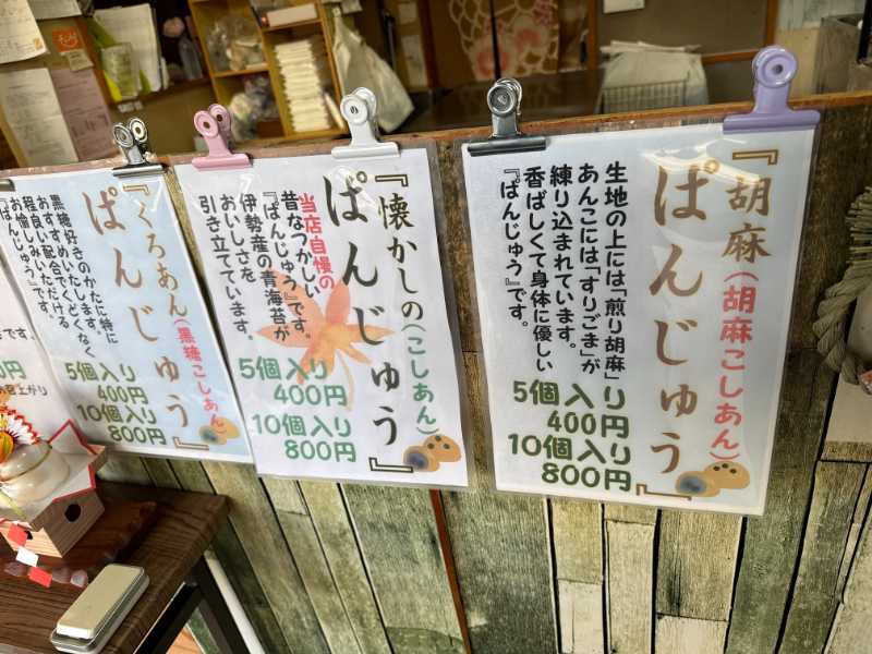 種類が色々ありますが、伊勢で定番のこし餡×青海苔のぱんじゅうは5個入からの販売だったので、今回はこちらのみ購入しました。