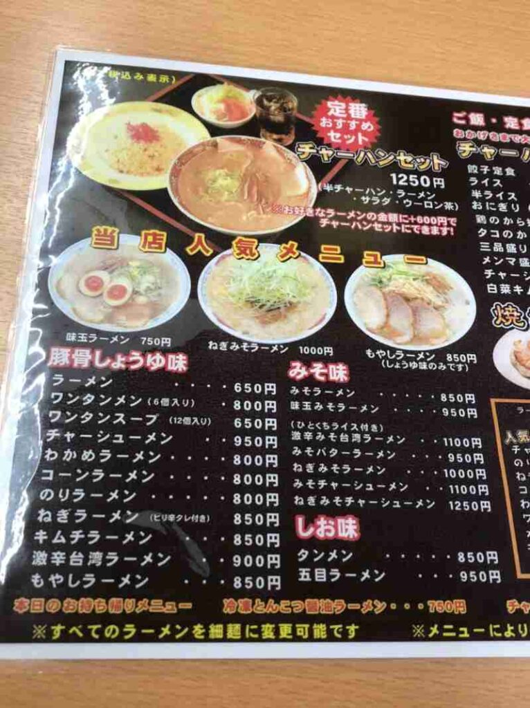 メニューを見ると、基本の豚骨醤油の他、味噌、塩、名古屋名物で有名な台湾ラーメンなどもありました。