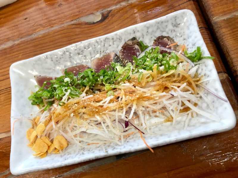 とりあえず刺身は食べるとして、あとはカツオの味噌たたき、そしてサバのハランボ(お腹の部分)のにんにく醤油焼きの合計3品を注文。