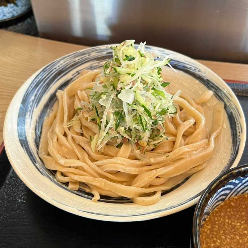 つけ汁はガツンと効いた味噌の旨みに香ばしいゴマの風味が広がり、濃口でクセになる味わい。