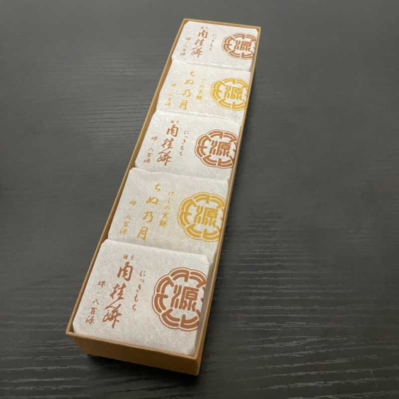 そして元禄の時代に八百屋宗源さんの子孫が堺の地で「八百源」という名で菓子商を始め、初代は家伝の菓子として伝わった「肉桂餅」から、「肉桂」を柔らかな求肥に練り混ぜて小豆のこし餡を包み、新しい菓子として販売したところ、堺の町衆の間で評判を呼び銘菓として好まれるようになったとのこと。