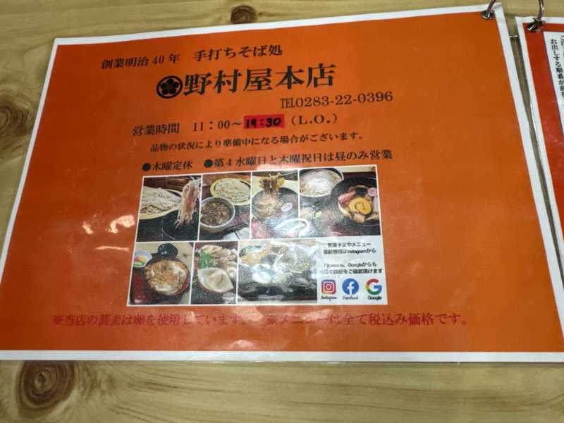 栃木県佐野市相生町にある、1907年(明治40年)創業の老舗そば屋『野村屋本店』。